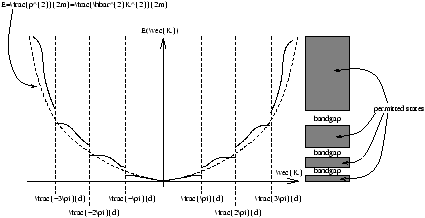 In the positive part of the x-axis in figure 7.3 the ??electron?? oscillates more frequently than the lattice period, in the negative region it oscillates less frequently. The bandgaps appear at these resonant K values.