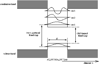 At a hetrojunction you get a step in the potential due to the difference in band gaps. The electrons get trapped in the middle layer with K velocities