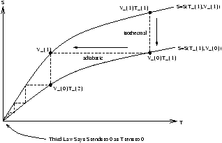 because S(T,V0) and S(T,V1) are convergeal at T=0 , so we need an infinite number of steps to reach T=0 .